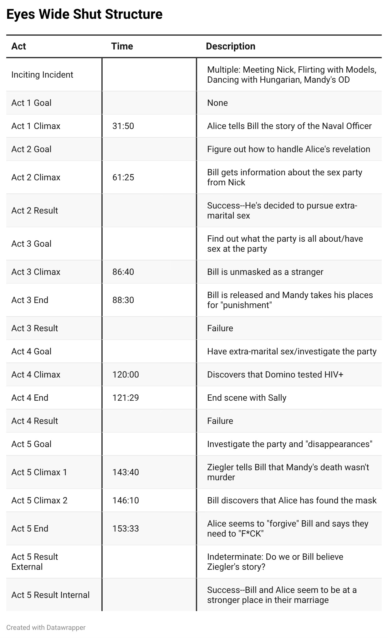 Now, five acts can be challenging to write. It's really hard to write acts that have new and different goals for every act, and as great as Eyes Wide Shut is, part of what we can see here, especially in the middle acts, acts two, three, and four, is that the goals sometimes tend to be very similar. So, if you look at my chart on The Hutch Files and you look at acts two, three, and four, you see that they do have kind of similar and somewhat overlapping act goals.