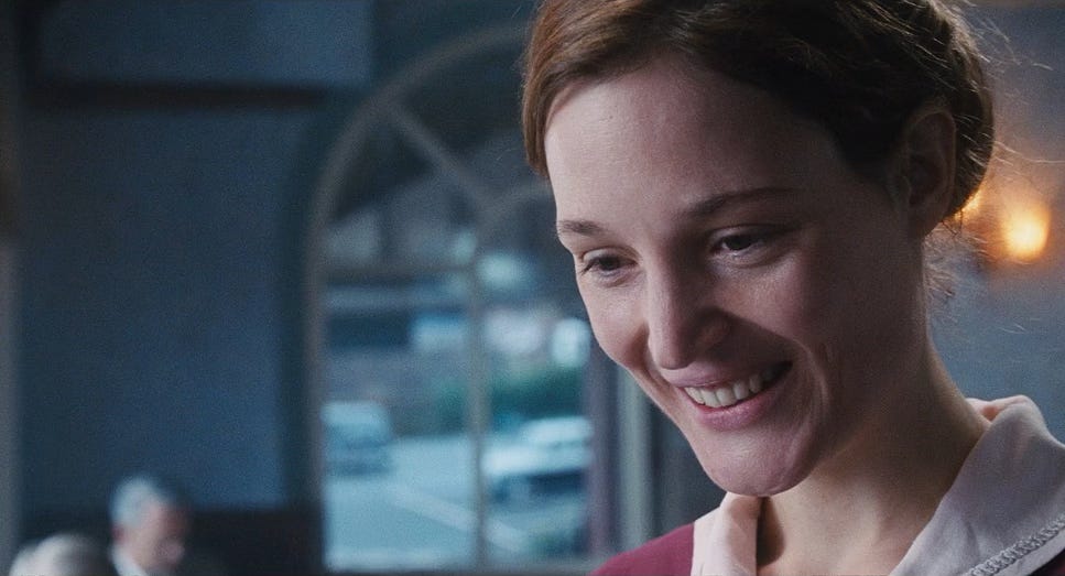 The initial scenes focusing on his fashion career leads the audience to believe that Woodcock’s external goal will involve in some way achievement as a fashion designer. However, things begin to veer off course when, in the inciting incident, Woodcock meets Alma (Vicky Krieps), a waitress at a local restaurant he sometimes frequents on his travels, this time while his car is being serviced. The attraction is immediate, and the rest of the act focuses on the development of their relationship. Woodcock brings Alma out to dinner after she has left him a very forward note, “For the hungry boy, my name is Alma.” After their dinner, Woodcock brings Alma back to his home and designs a dress for her in a very intimate yet awkward fashion, as he takes her measurements while she is wearing only a slip, with Cyril watching and taking down her measurements. Despite the awkwardness, and Woodcock’s seemingly derogatory comments about her measurements, Alma agrees to try on an already made dress, and the entire scene almost feels like the equivalent of a sex scene as Alma entrusts herself to Woodcock’s intimacy (there is never a sex scene in the movie—though both designing and eating often replace sex as intimate activities for Woodcock and Alma. And despite the extremely obvious double entendre of Woodcock’s name, we never come close to seeing Woodcock’s…). The act ends with Woodcock declaring he’s been looking for someone like Alma for a very long time, and Alma replying, “You found me.”