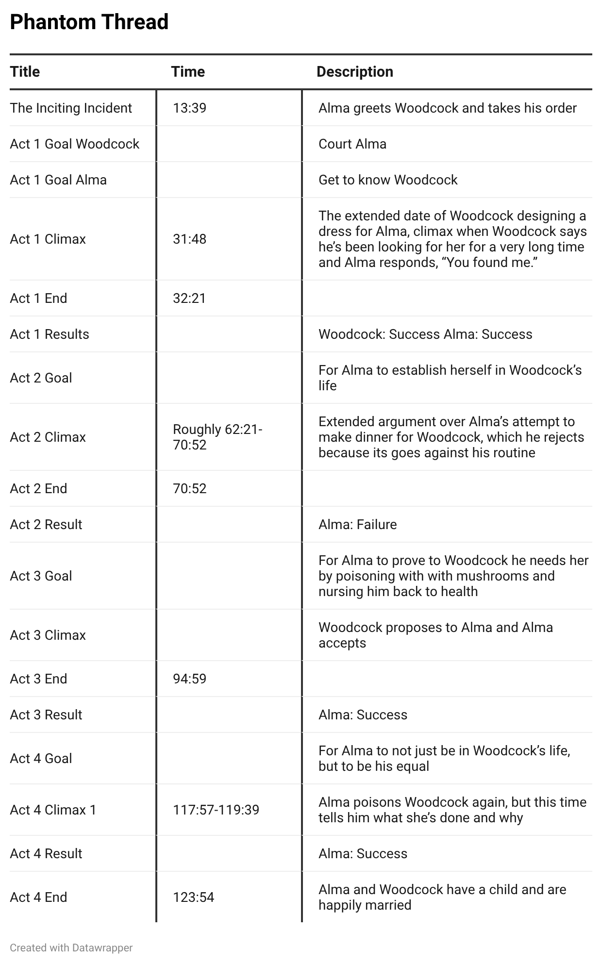 Because Alma only has an external relationship goal, her ending is quite clear and easy to understand. After poisoning Woodcock for a second time and getting him to finally see and understand who she is and how she must fit into his life, she succeeds at her goal. She doesn’t need to change, and since she only has one goal, there isn’t an internal goal that depends on success of the external goal (or vice versa).