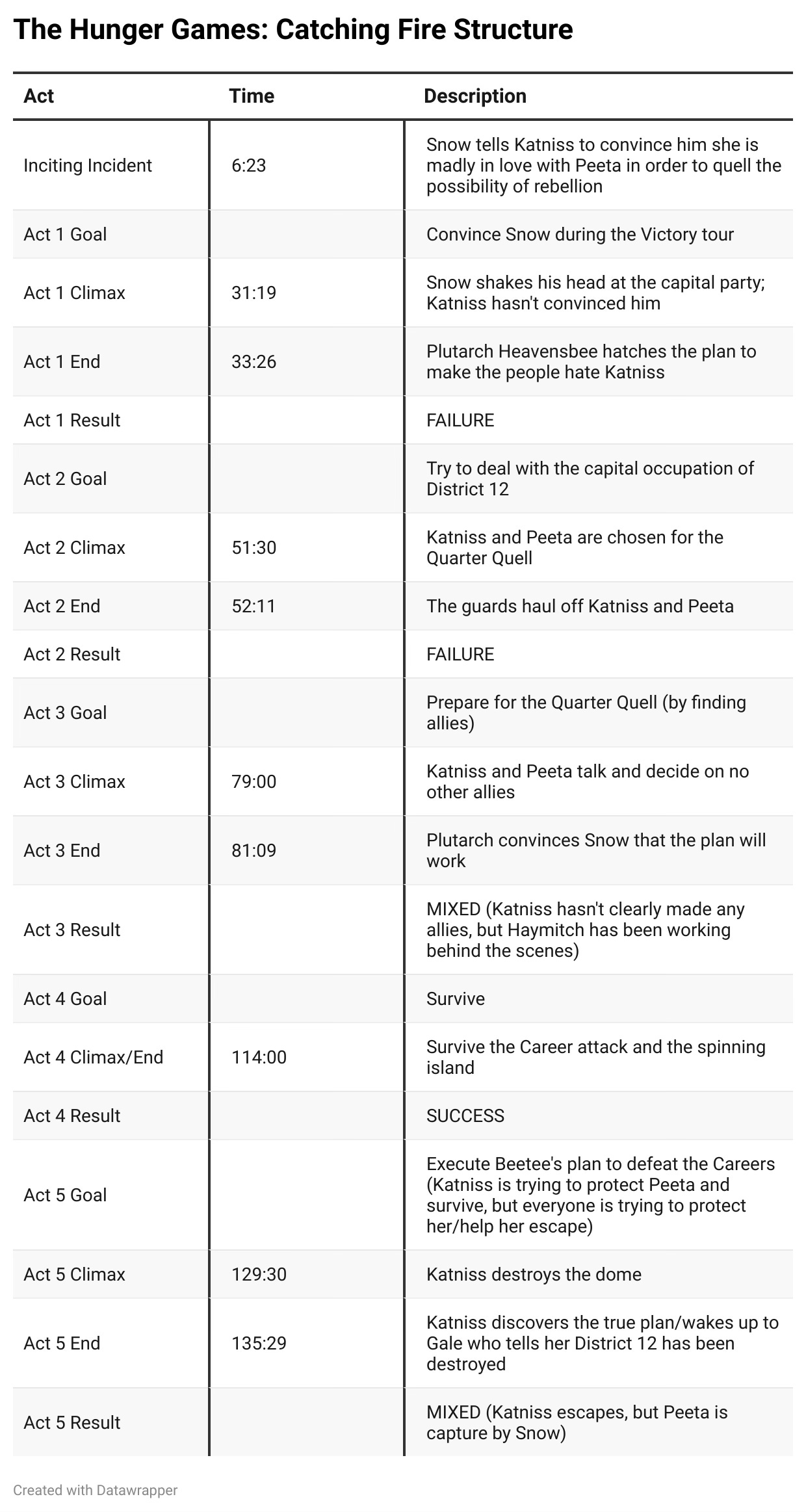 Finally, we have the climax of Katniss and Peeta being chosen for the Quarter Quell. So rather than having the one-act setup of The Hunger Games, we actually have both Acts One and Two functioning as setups for Catching Fire. From there, the rest of the structure is pretty similar to the original.