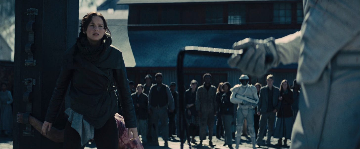 This leads to the famous scene where Gale stops one of the soldiers of Snow's army from attacking someone, and he ends up getting strapped to the whipping post. Then, both Katniss and Peeta eventually come out to try to stop the whipping.