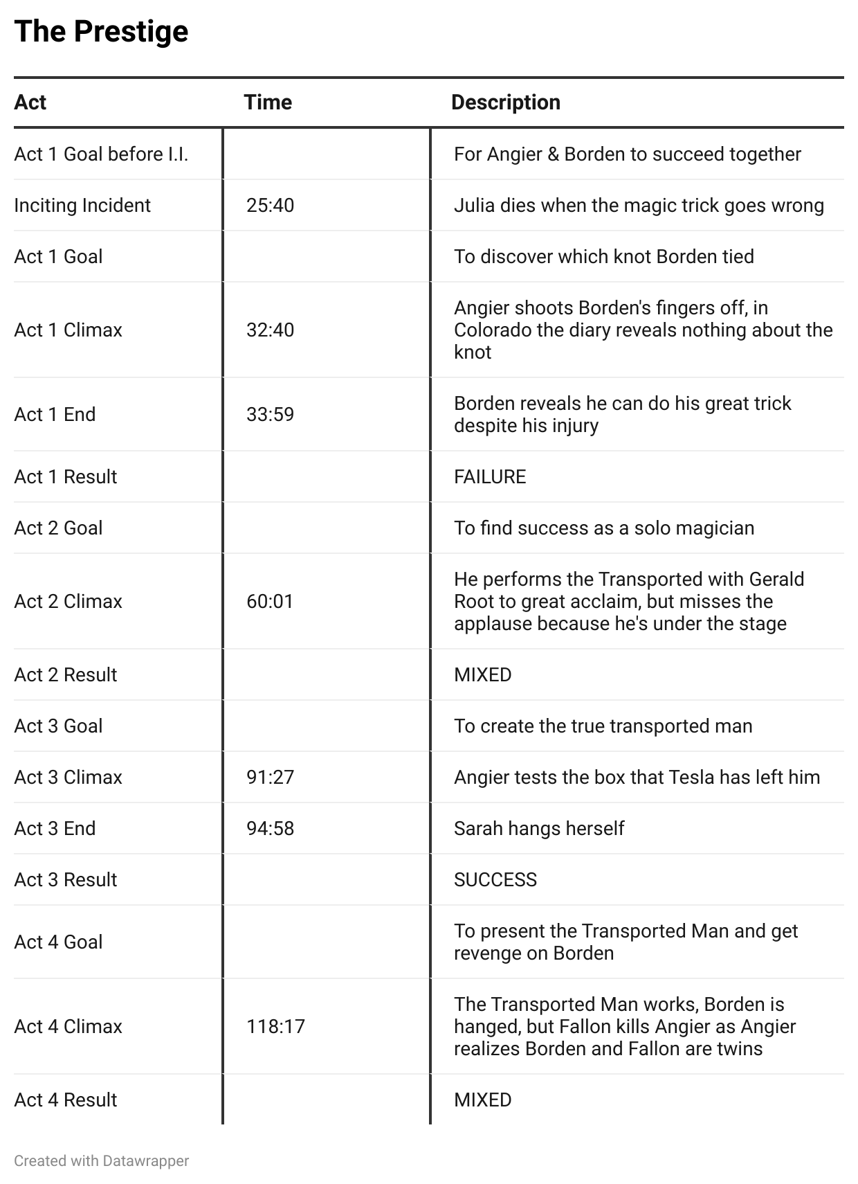 Act 1’s often have no goal. In general, we are introduced to a status quo for the protagonist and other characters, which is disturbed or interrupted by the inciting incident. The goal before the inciting incident usually centers around the normal lives of the characters at that moment. In The Prestige, Angier and Borden are trying to succeed together as magicians. This is disrupted, of course, by the death of Julia due to Borden’s use of the more dangerous knot. After Borden lies about the knot at Julia’s funeral, the narrative interestingly focuses on Borden’s life as we meet Fannon and discover that Sarah is pregnant. Given the quick pace of the movie, it makes some amount of sense that it doesn't focus too much on Angier’s grief. Having said that, Angier does have a goal after the inciting incident, which is to discover the truth of the knot, and in a related act, get revenge for Julia’s death. The act climaxes when Angier shoots Borden in revenge, then as the movie jumps forward to Colorado, Angier discovers that even in the journal, Borden is unsure of which knot he tied (of course, this is false as the journal is a fake). Despite there not being a strong Act 1 goal after the inciting incident, Angier’s desire to know about the knot does provide some forward momentum and results in a climax. Additionally, Borden’s storyline takes up additional scenes in the final 7-8 minutes of the act after that inciting incident.