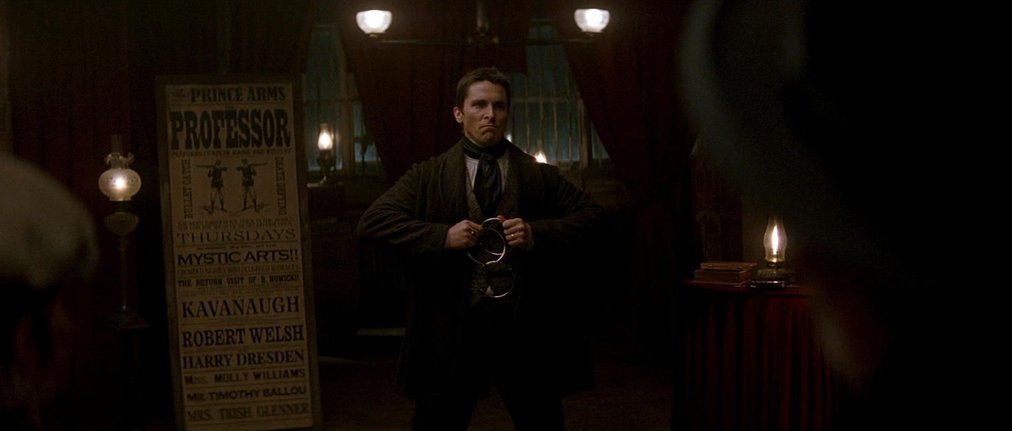 Movies sometimes impose an “external” structure on a movie in the form of title cards, changes of season, changes of day etc. Sometimes these breaks parallel the actual structure of the narrative (Moonlight for example). Other times, while the imposed structure might be revealing, it doesn’t always parallel the actual goal structure of the film (Grand Budapest Hotel for example, which has five title cards, three of which come in the first 35 minutes). In The Prestige, we have an interesting structure that is more subtly imposed on the film: the three-part structure of a magic trick. Right at the start of the movie Cutter narrates to us in voice over that a magic trick has three parts–The Pledge, The Turn, and The Prestige. Given the cleverness of the Nolan brothers it would be almost impossible for them not to parallel the three acts of a magic trick with the traditional three acts of a movie. And indeed, while the movie has four goal-based acts, they still parallel the three act structure of a magic trick, though the Nolans are quite subtle about this.